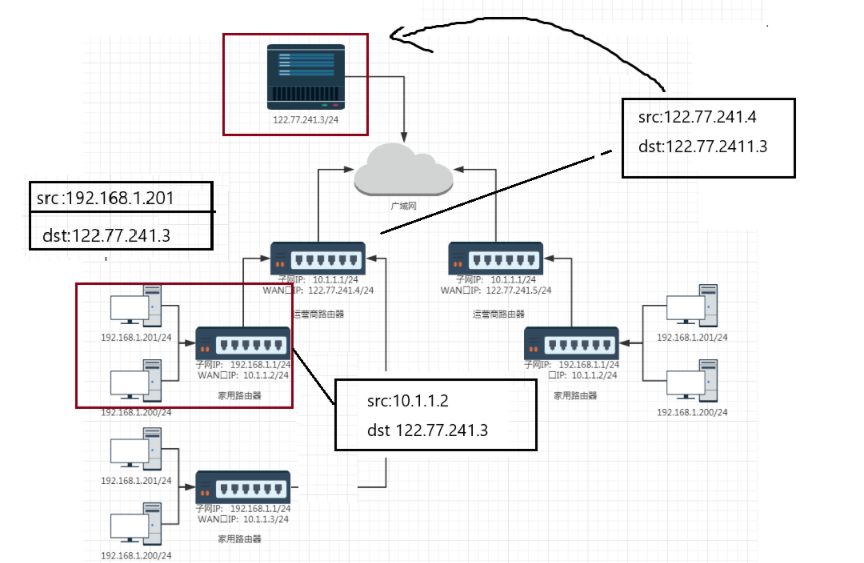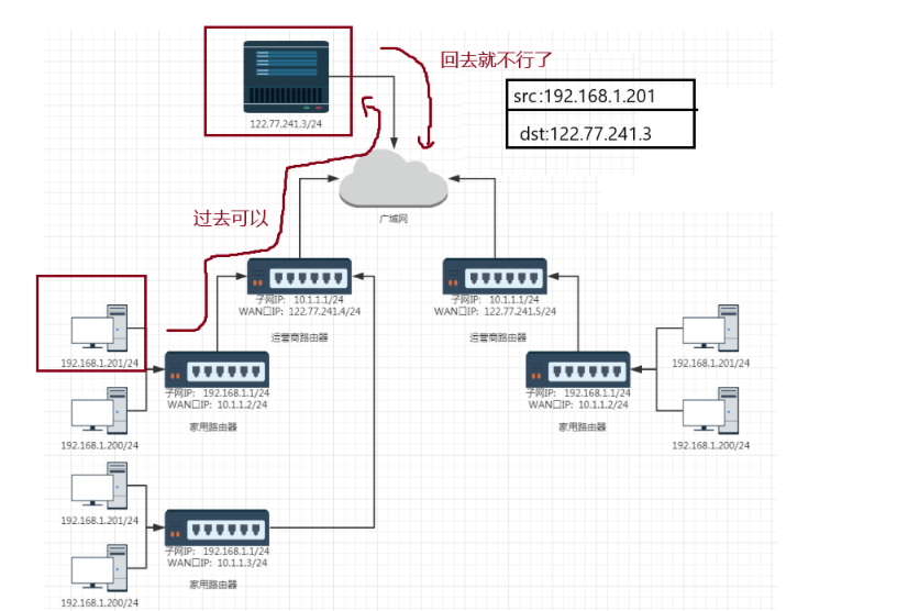 当报文需要回去是,发现在广域网中找不到192.168.1.201,因此私有IP不能出现在公网上,这是由于报文回不来了