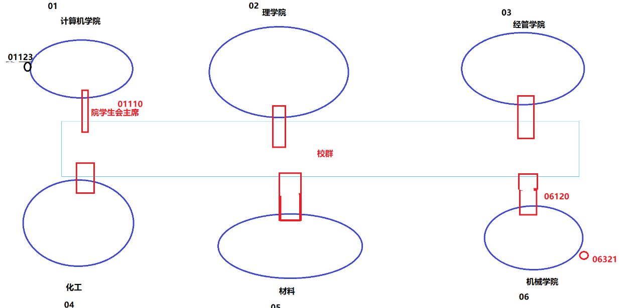 首先看一下场景,某个学校,有六个学院,每个学院都有对应的编号,而每个学生则有对应的学号,学号前两位就是自己对应学院的编号,每个学院再选出一个主席,并建立一个校群