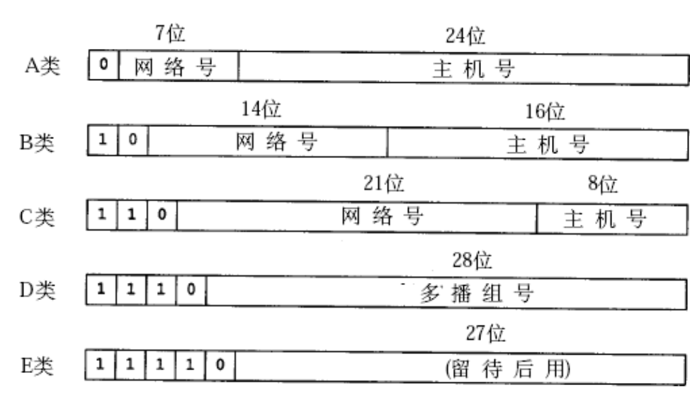 过去曾经提出⼀种划分⽹络号和主机号的⽅案, 把所有IP 地址分为五类, 如下图所⽰