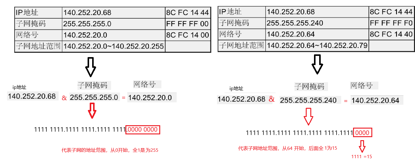 可⻅,IP地址与⼦⽹掩码做与运算可以得到⽹络号, 主机号从全0到全1就是⼦⽹的地址范围;