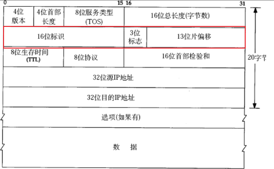 关于16位标识(id),3位标志字段,13位分⽚偏移下文叙述