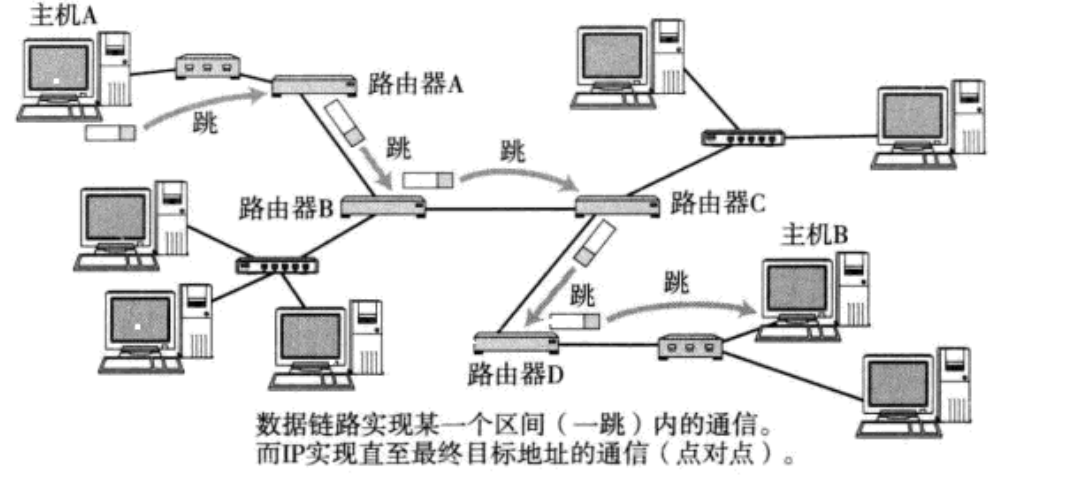 路由的过程, 就是这样⼀跳⼀跳(Hop by Hop) "问路" 的过程. 所谓 "⼀跳" 就是数据链路层中的⼀个区间. 具体在以太⽹中指从源MAC地址到⽬的MAC地址之间的帧传输区间.
