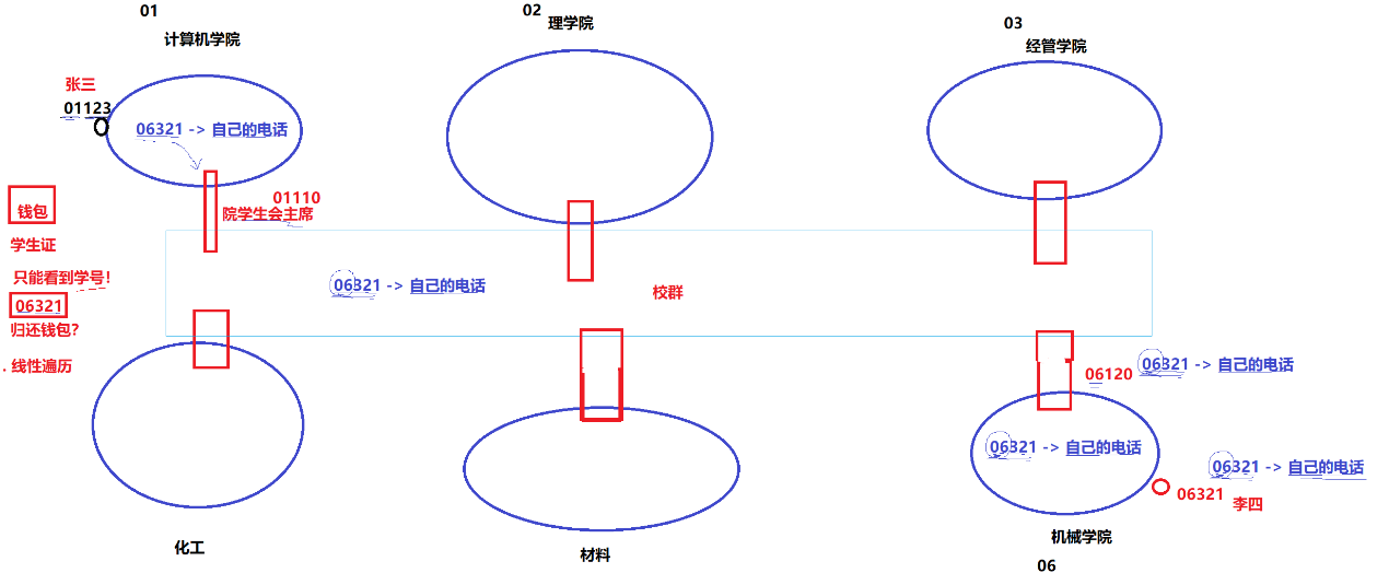 此时就有个场景,张三的学号是01123,他捡到了一个钱包,里面有李四学生证,学生证上面的学号是06321,为了归还钱包,张三就把李四的学号以及自己的电话号码给了自己学院的主席,主席看到李四的学号(只会看前两位)就会@对应学院编号的主席,对应学院编号的主席就会拿到学号(只看后三位)并通知李四