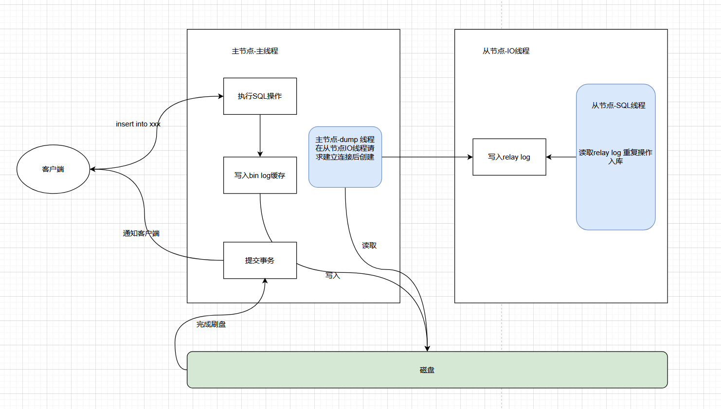 - 主节点将 bin log 缓存中的事件刷入 磁盘 bin log 文件,事务提交完成,向客户端返回处理成功响应