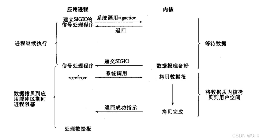 该种方式的特点是逆转了IO事件就绪的方式,通过信号的方式。虽然采用的是信号驱动,只是改变了等的不同,数据拷贝还得自己做,因此还是属于同步IO,只要参与IO过程的(等+拷贝)就是同步IO,需要注意的是,信号驱动式IO也是只有一个文件描述符,因此IO效率这块还是取决于发送方,效率和非阻塞/阻塞IO没有本质区别,只不过类似非阻塞IO一样,,能合理利用等的时间,而且不用自己轮询。