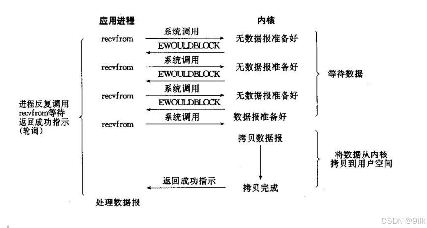 - 非阻塞IO:如果内核还未将数据准备好,系统调用仍然会直接返回,并且返回EWOULDBLOCK 错误码,非阻塞 IO 往往需要程序员循环的方式反复尝试读写文件描述符,也就是轮询,这对 CPU 来说是较大的浪费,一般只有特定场景下才使用