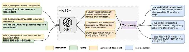 文档片段展示了其工作方式,HyDE能处理各类查询,且不需要修改底层的GPT-3和Contriever/mContriever模型。