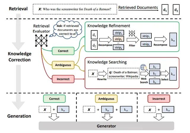 检索评估器的工作原理:评估检索文档与输入的相关性,估算置信度,然后根据结果触发不同的后续动作------{正确、错误、模糊}三种状态对应不同处理路径。