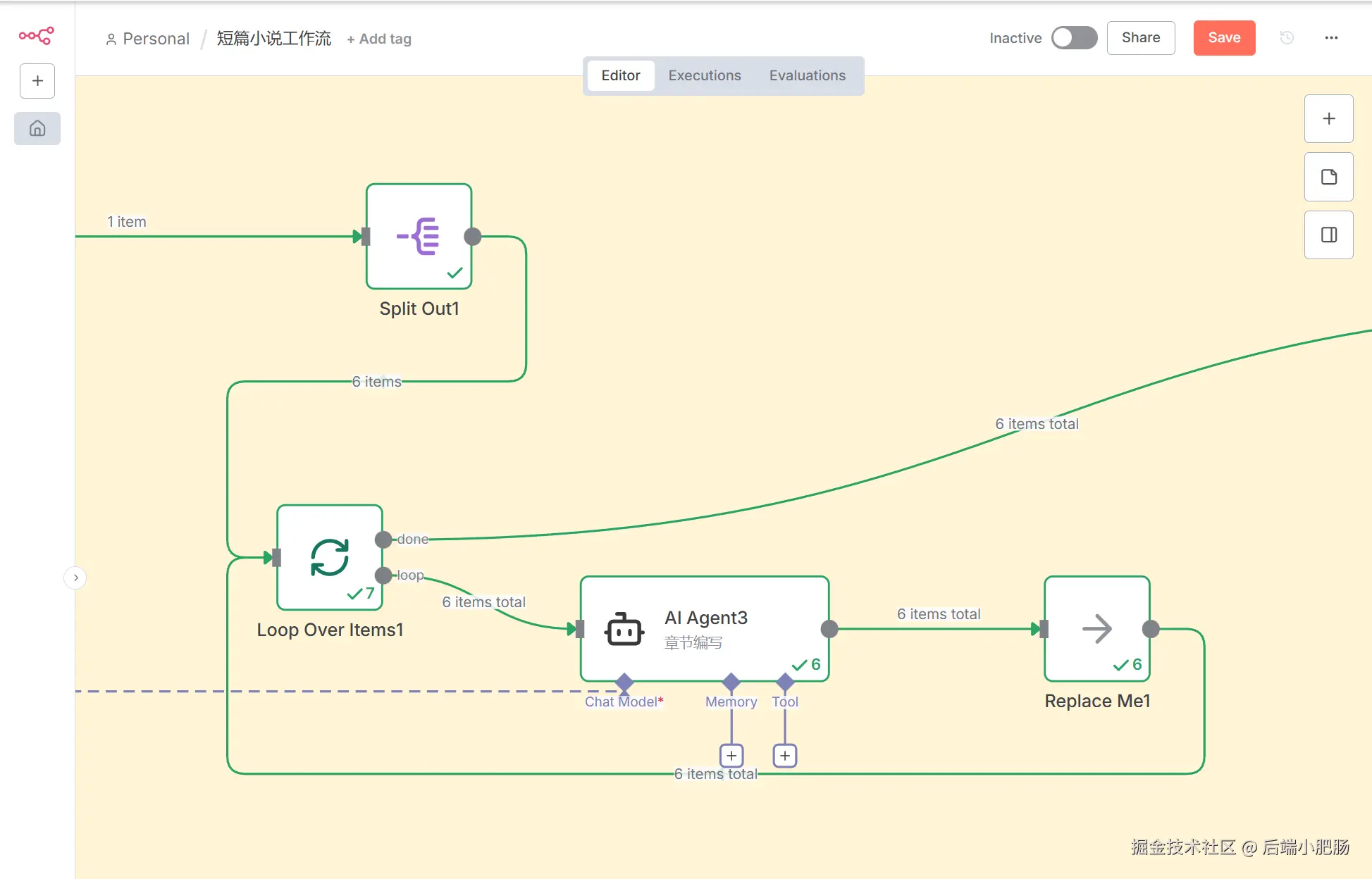 在循环中开启章节编写:Split Out 节点出来后就进入了详细章节编写环境,下图中基于循环结合AI Agent完成了每个章节的编写。