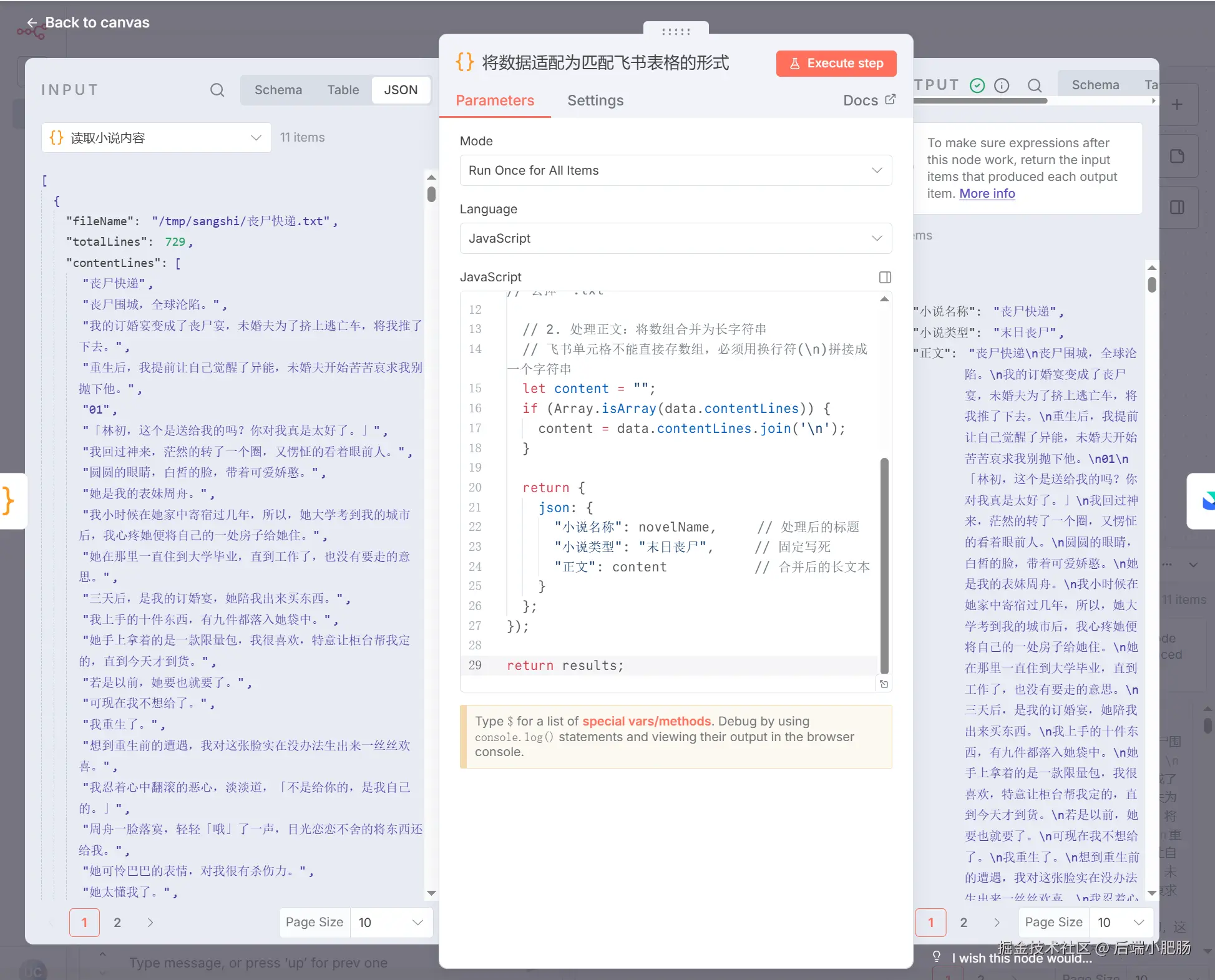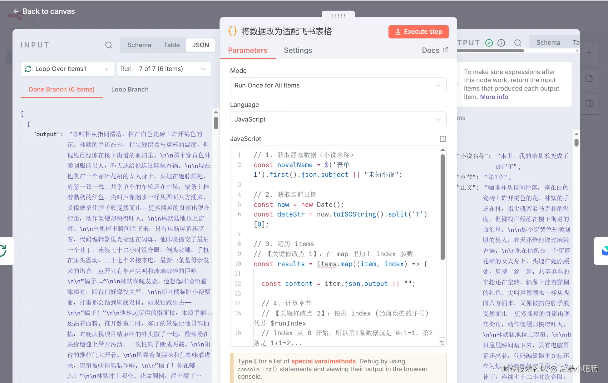 将数据改为适配 飞书 : 小说章节编写完毕退出循环时后接Code in JavaScript 节点。 这个节点的作用是将前置节点生成的小说数据修改为适配飞书多维表格的形式。