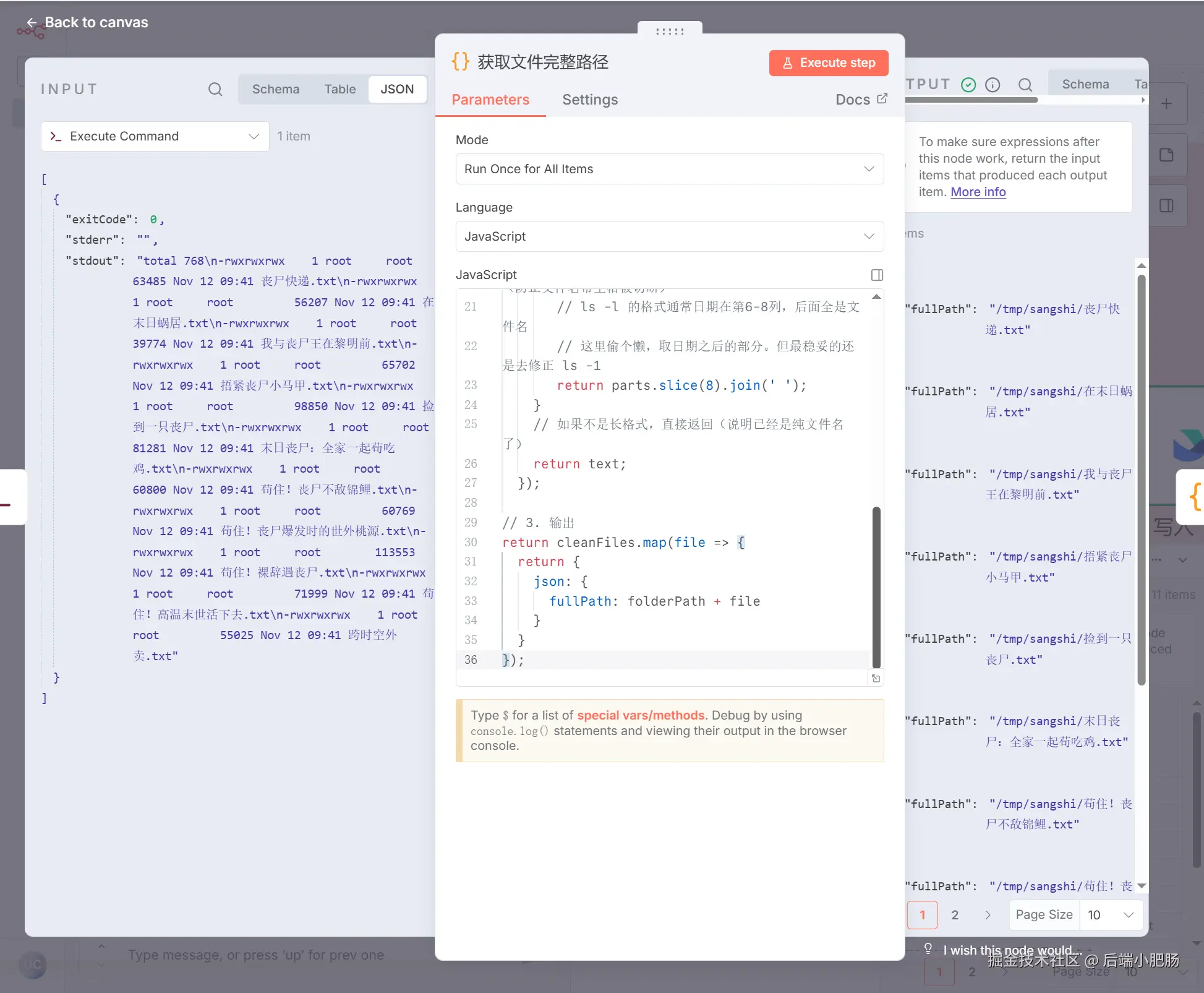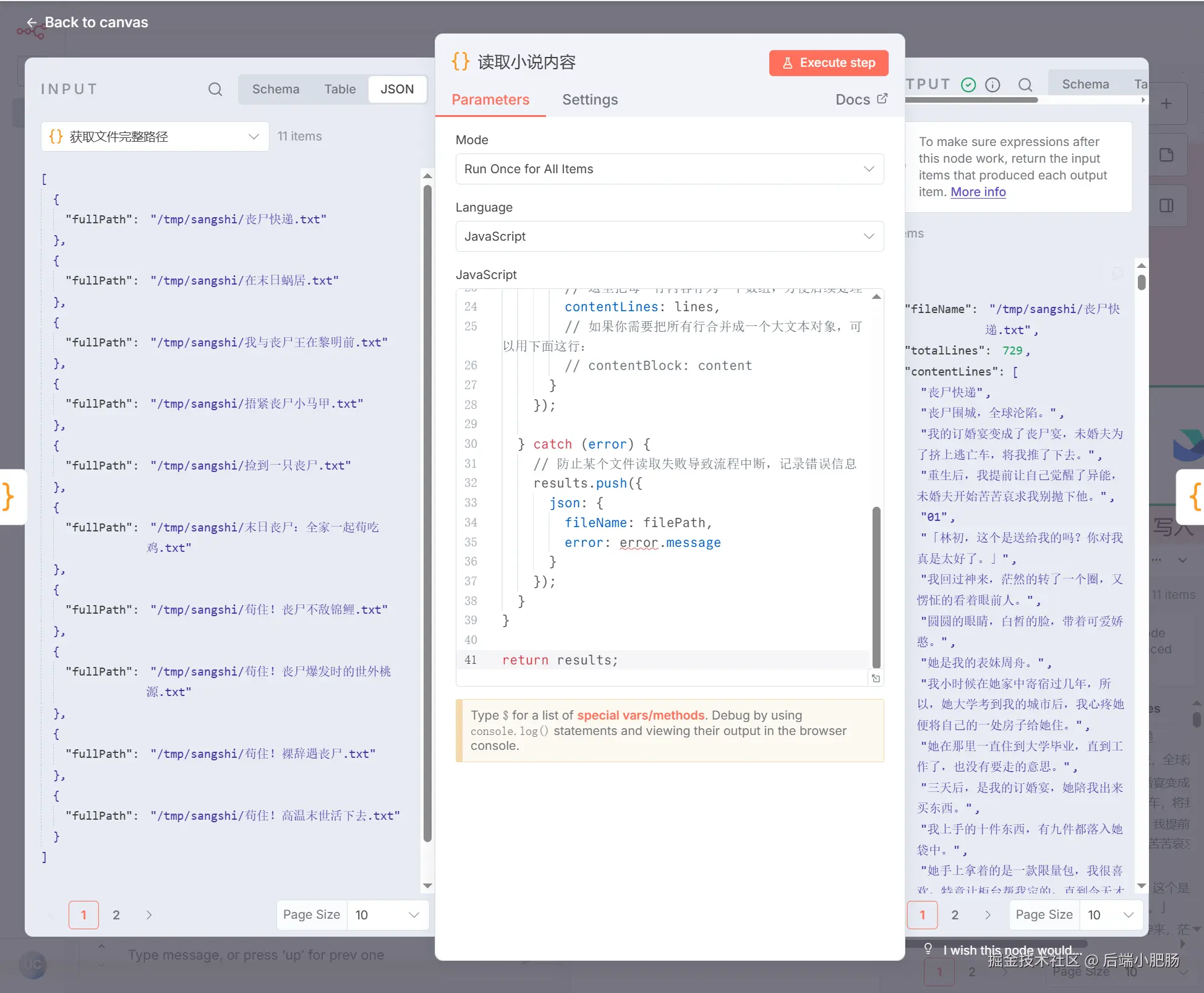 获取文件路径(代码):Execute Command节点 节点出来后点击【+】新增Code in JavaScript 节点。这个节点的作用是结合代码获取每个小说文件的完整路径。