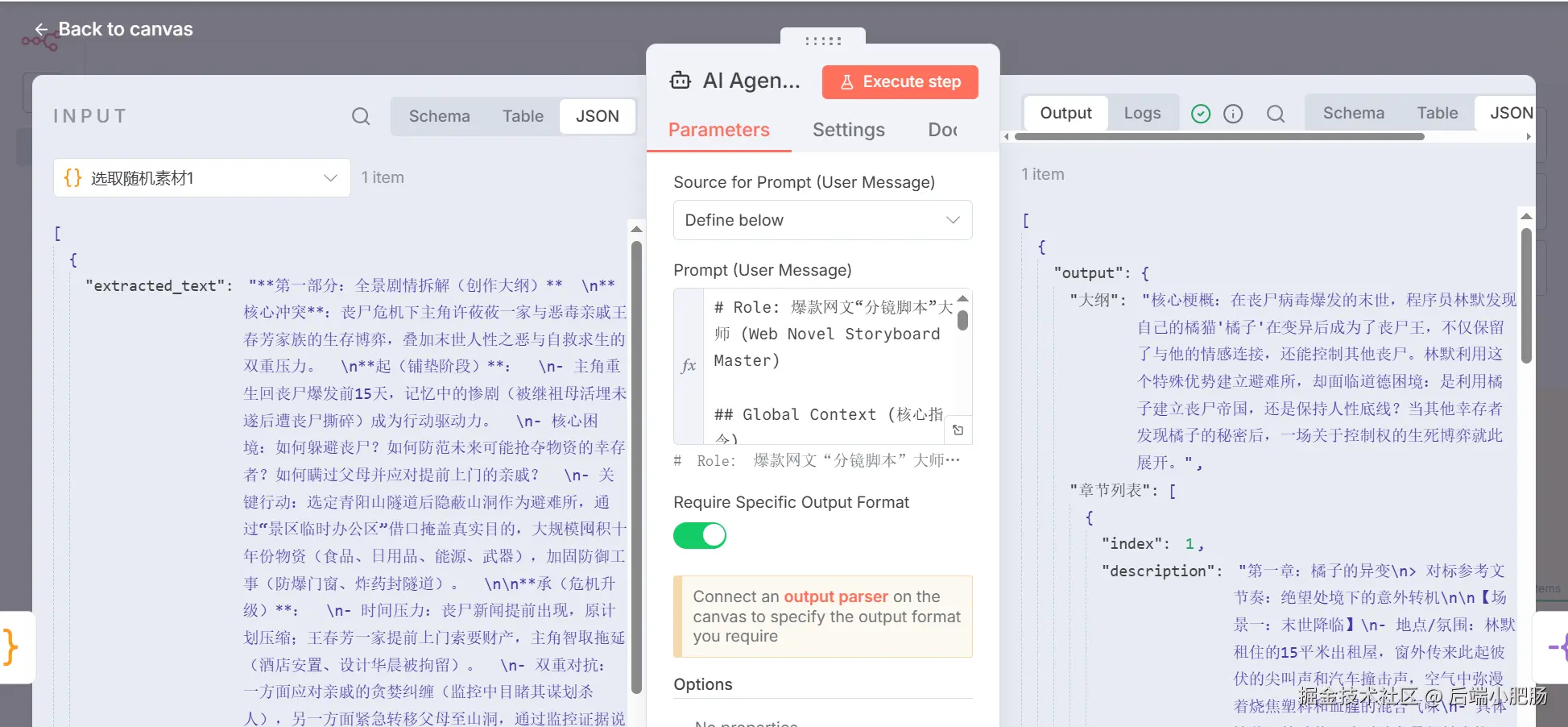 编写大纲(AI Agent): 飞书 节点(根据领域去飞书表格中获取素材) 节点出来后点击【+】新增AI Agent节点。 这个节点的作用是根据飞书表格提取出的小说素材 结合开始节点用户输入的主题进行小说大纲的编写。