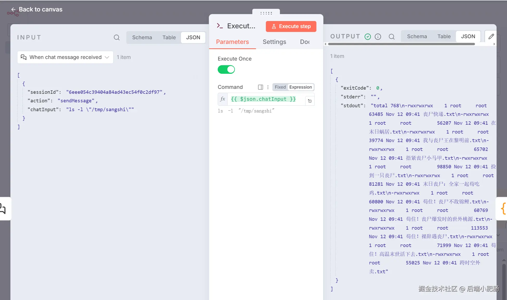 Execute Command:开始节点 出来后点击【+】新增Execute Command节点。 这个节点的作用是执行命令,如下图中所示在前置的chat节点传入了命令ls -l "/tmp/sangshi",那么这个节点就会执行这个命令去查看文件夹下的文件列表。