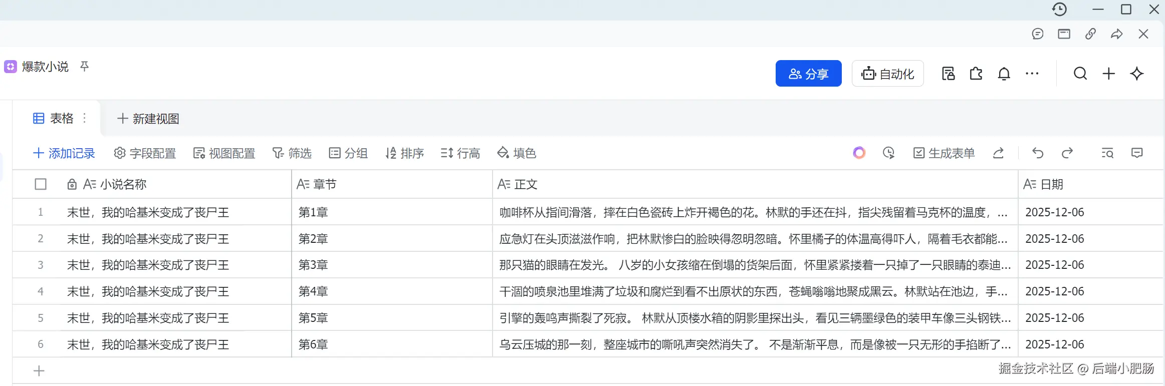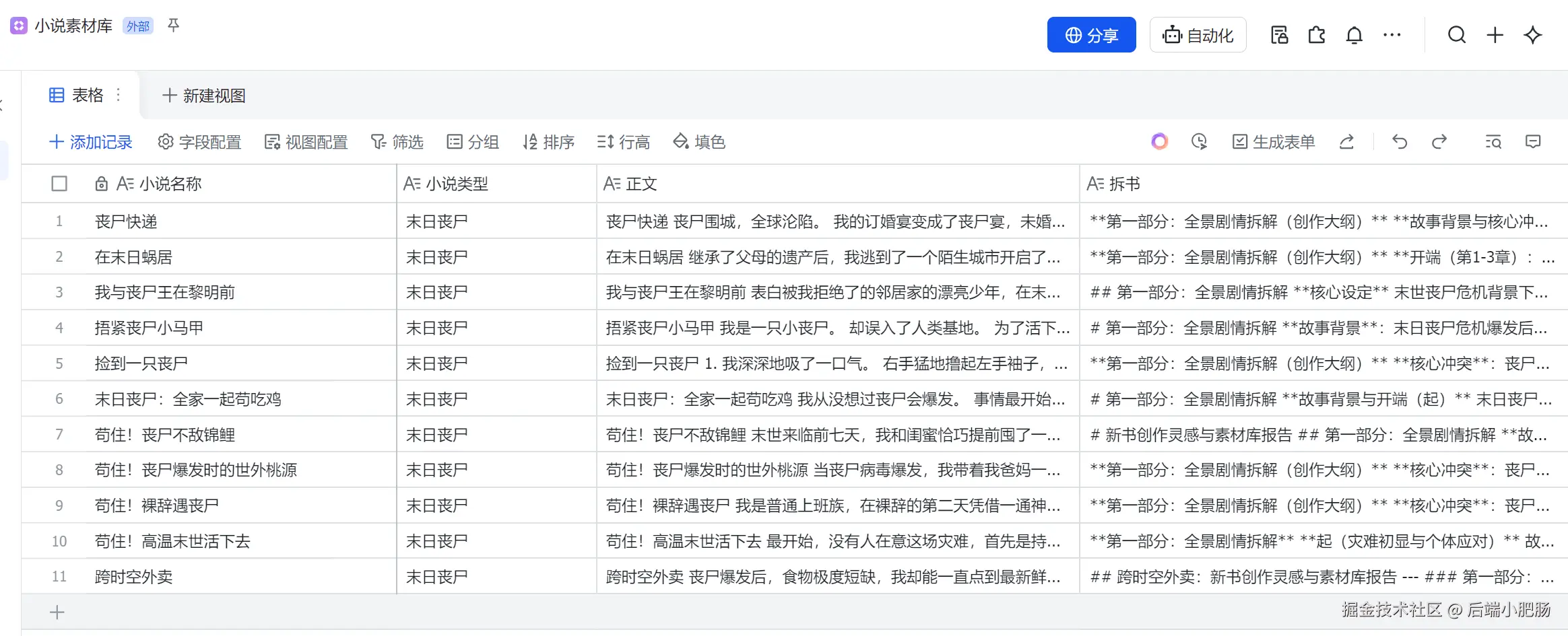 第一个部分是将本地已经收集到的爆款短篇小说写入到飞书多维表格作为小说写作素材库。