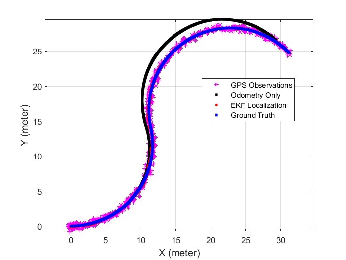 EKF算法做机器人轨迹定位/跟踪的程序,与里程计算法进行对比,结果显示EKF算法定位/跟踪精度更高。 纯里程计的误差为 error_Odom_average = 1.0283 Ekf定位的误差为 error_Ekf_average = 0.071629