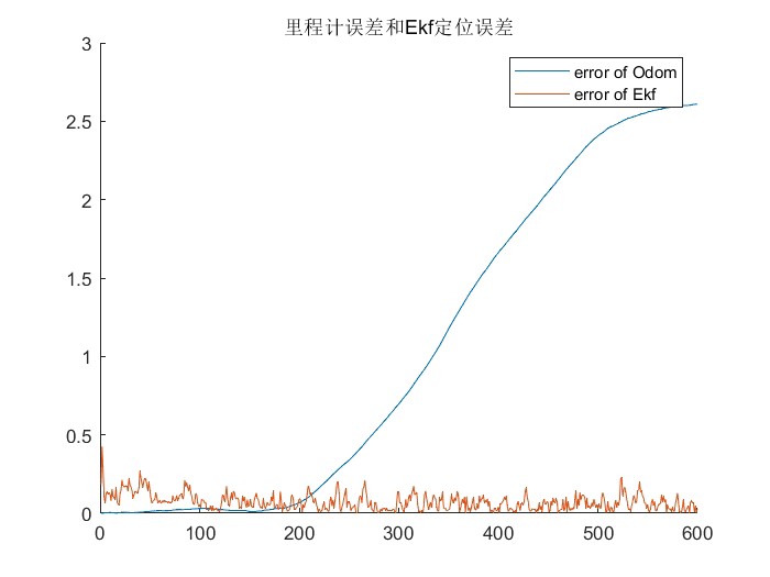 经过测试,EKF定位的误差平均值仅为 errorEkfaverage = 0.071629。这和里程计算法的误差相比,简直小太多了。