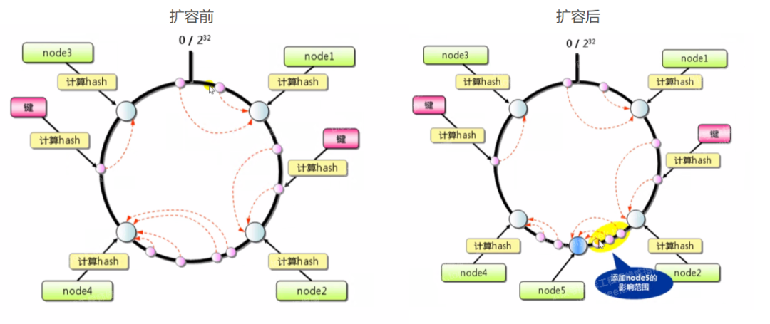 例如,将四台服务器均匀分布在环上,每个节点负责从其前一个节点到自身的区间内的所有键;若增加一台服务器则根据负载情况决定插入位置,计算请求HASH键如果正好落于 node5 (server 5) 负责于自身区间中与前一个节点范围,则由其路由转发。