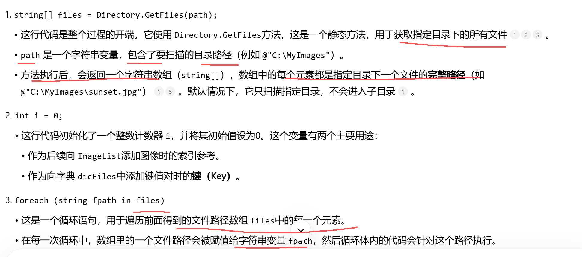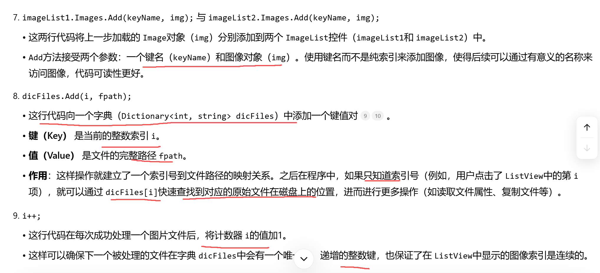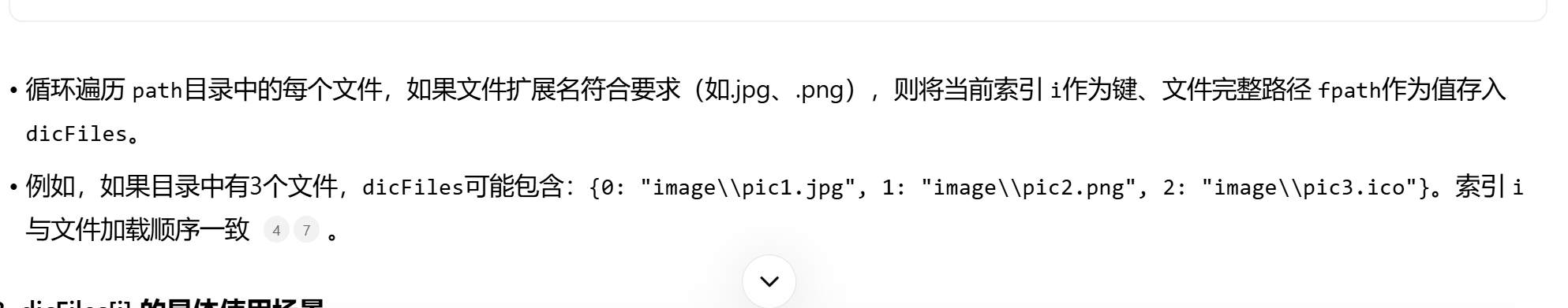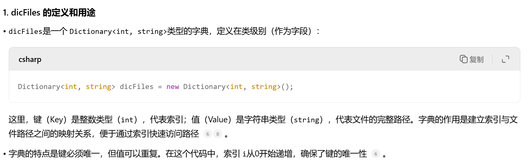 注意:循环中的索引 i与 dicFiles的键严格对应(因为填充时 i是顺序递增的),因此 dicFiles[i]能正确检索路径。如果索引 i不存在于字典中,会抛出 KeyNotFoundException,但代码中通过循环范围控制避免了这一问题
