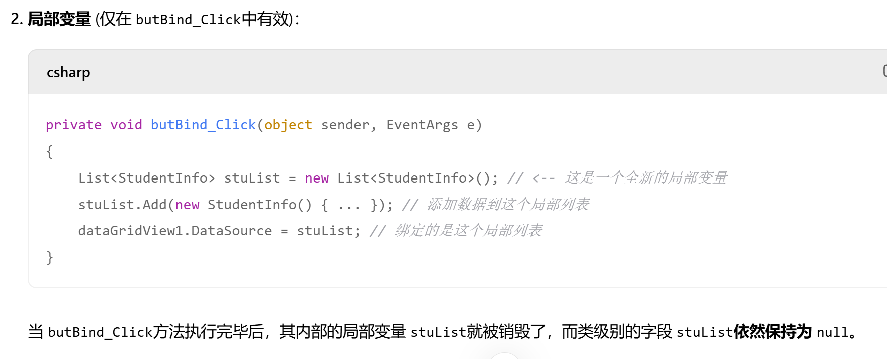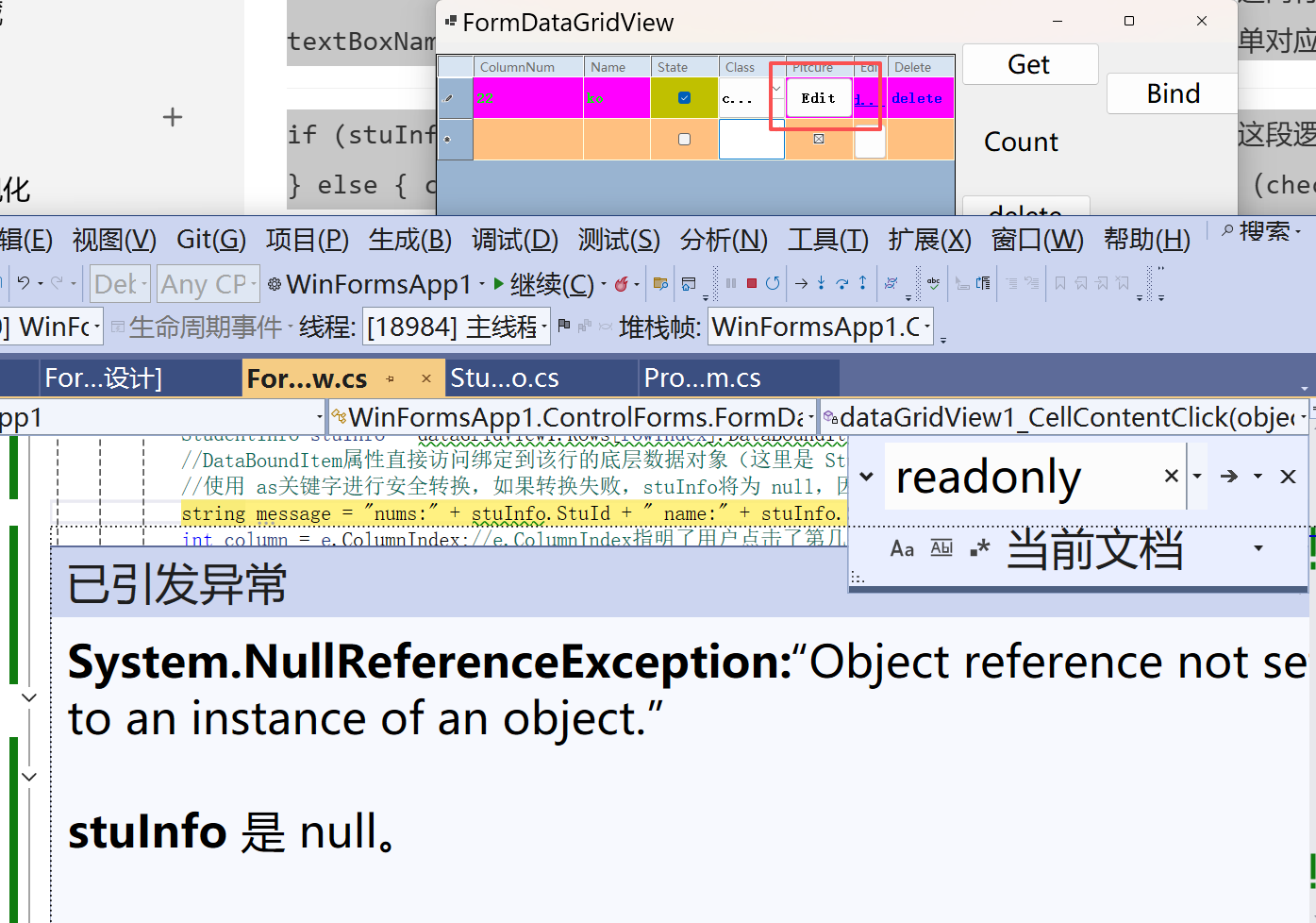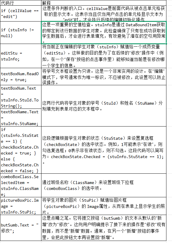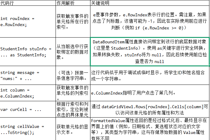 //这段代码是从 DataGridView 的单元格点击事件中提取的,主要用于获取当前选中行的绑定数据对象(StudentInfo)以及被点击单元格的显示值。