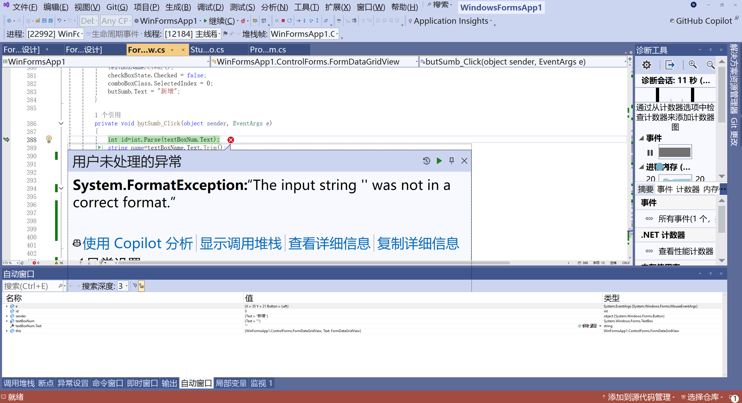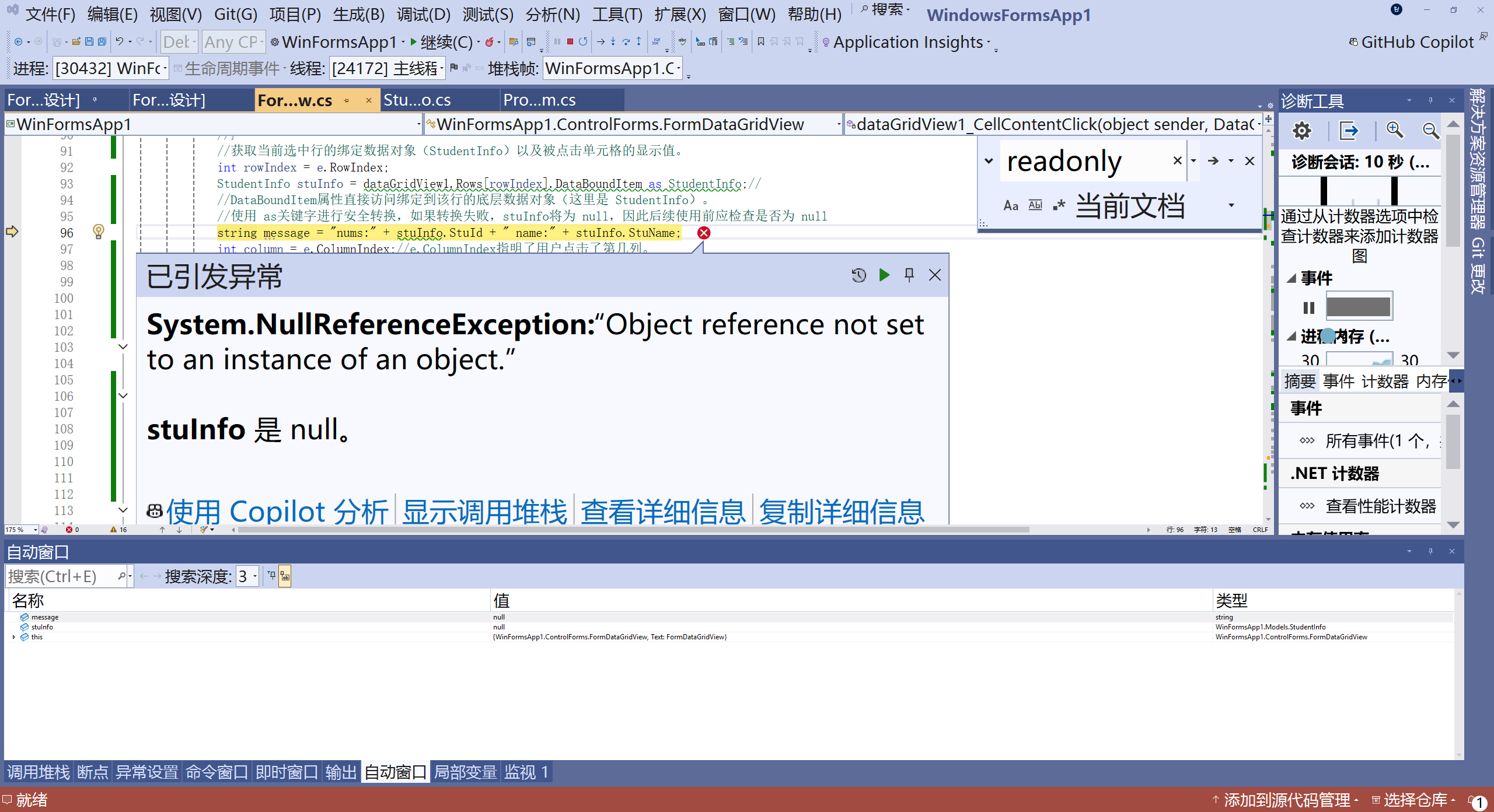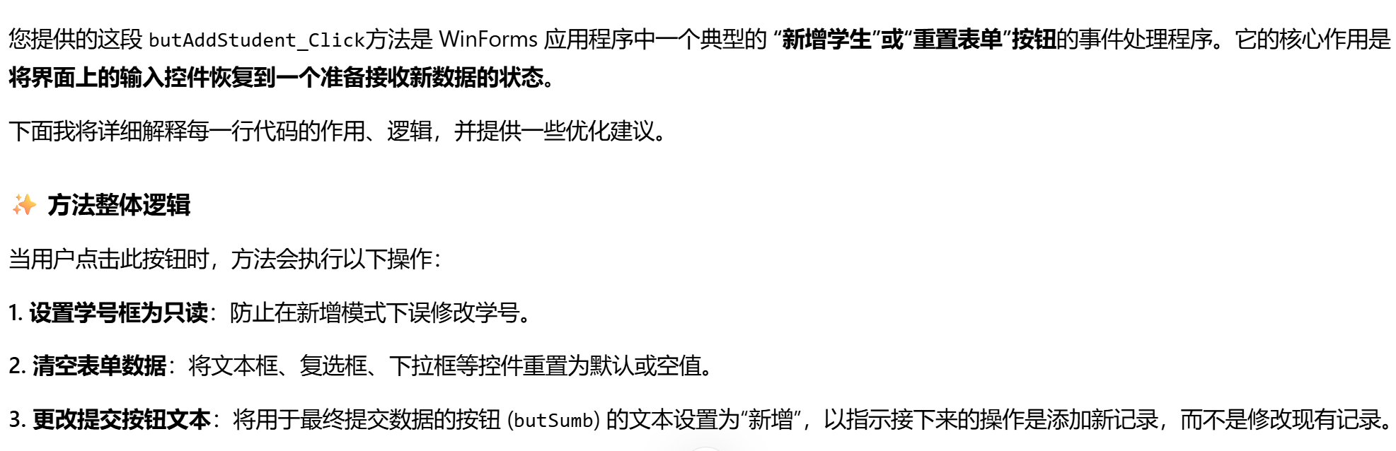 //这段代码是从 DataGridView 的单元格点击事件中提取的,主要用于获取当前选中行的绑定数据对象(StudentInfo)以及被点击单元格的显示值。
