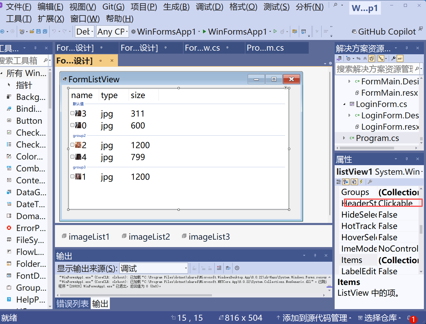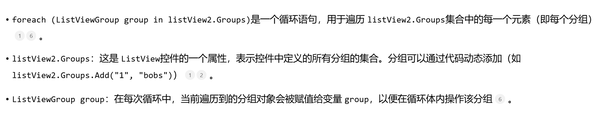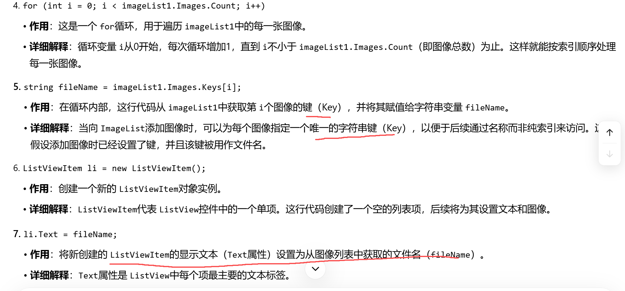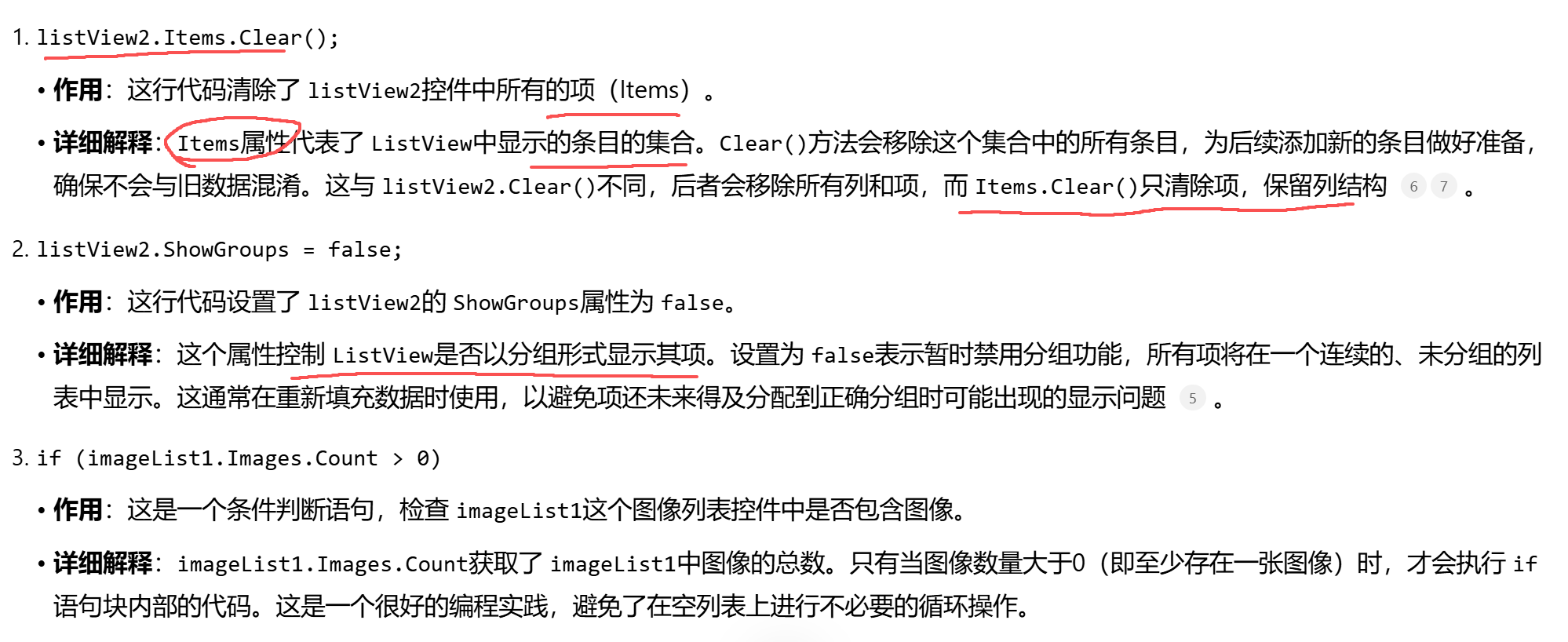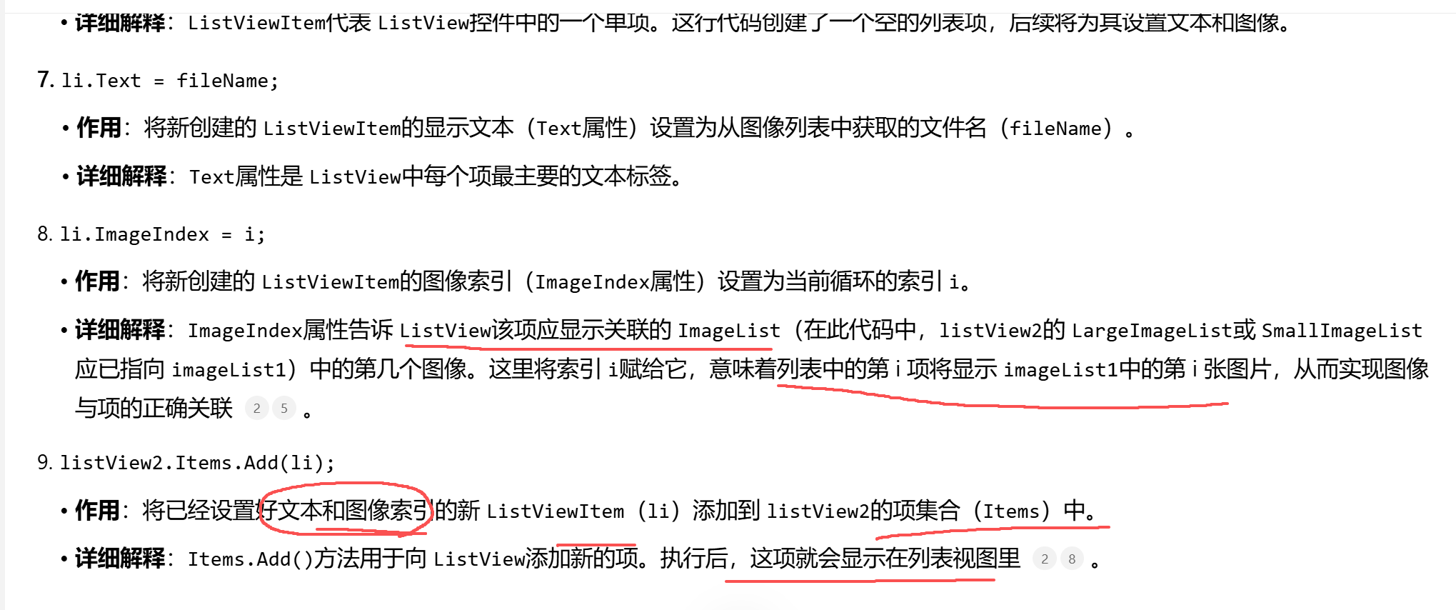 这段代码组合起来,实现了一个标准的初始化或刷新 ListView显示内容的过程:先清空旧项,然后根据数据源(这里是 imageList1)逐个创建新项并添加。