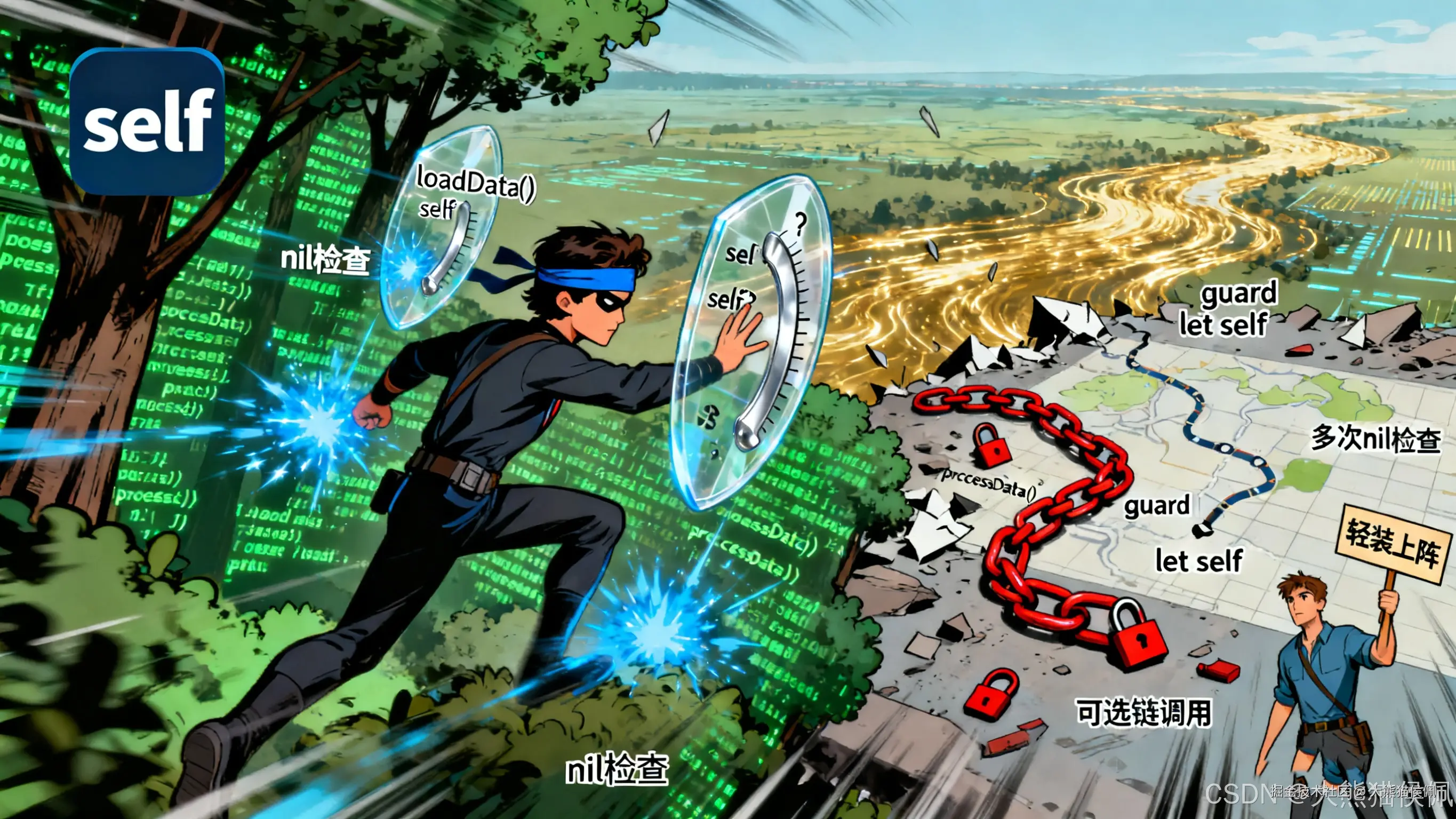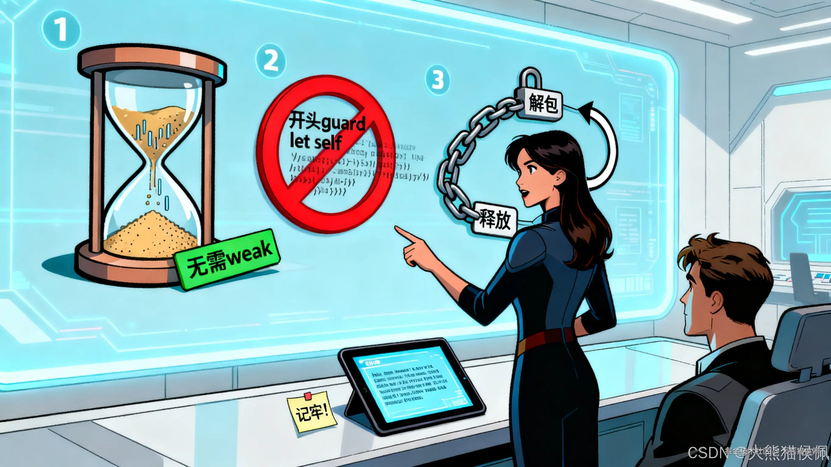 guard let self会瞬间将弱引用转为强引用,等同于 "主动绑炸弹"。 - 按需解包,用完即释 :需要 self 时再解包,且尽量缩短强引用时长(如放在循环内部);也可直接用