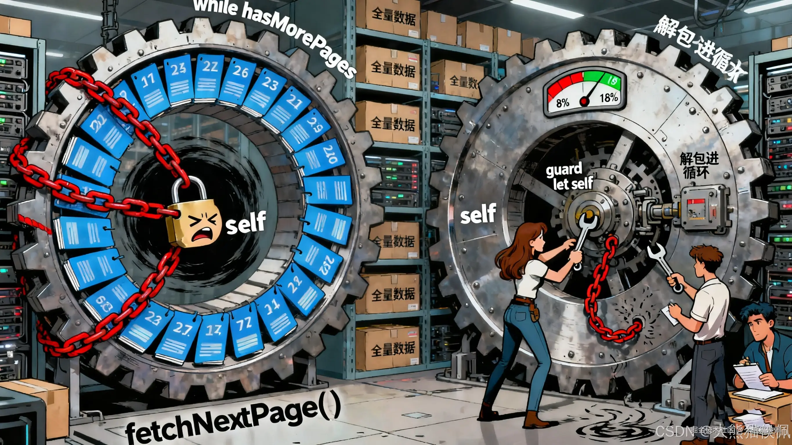 "这个 Task 一旦启动,self 就被强引用到循环结束," 杰克懊恼地拍了下桌子,"如果加载 100 页数据,self 就得被绑 100 次请求的时间 ------ 要是中途页面销毁,self 根本释放不了!"
