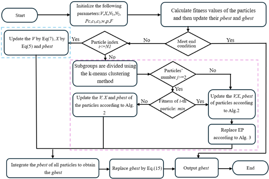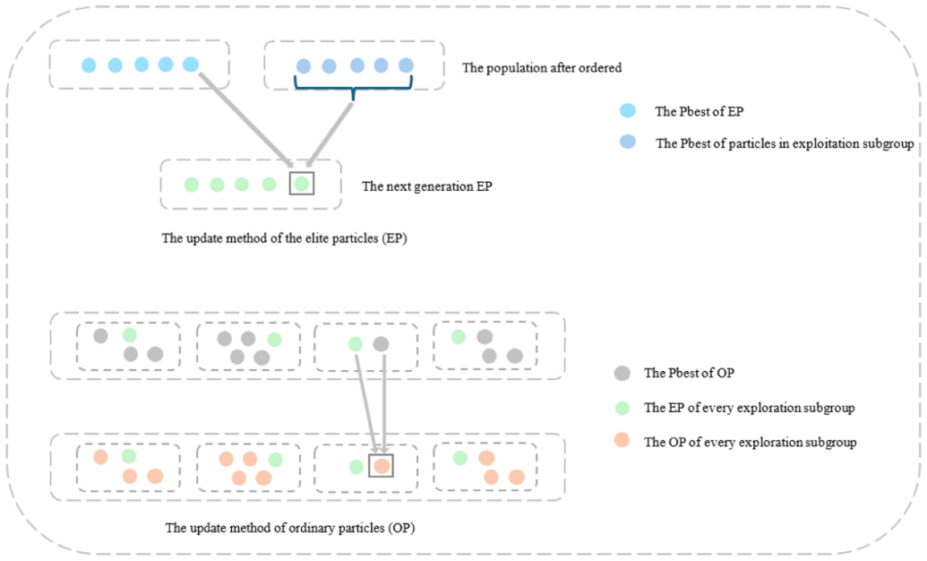 为增强粒子协作与信息交流,本文在 RS 经 k-means 划分后的子群中构建了精英--普通粒子分层策略(SEO)。每个子群按适应度划分出一名精英粒子(EP),其余为普通粒子(OP)。EP 负责在高质量区域进行深度开发,OP 在 EP 的引导下扩大搜索范围或探索新的区域,从而保持多样性并提升全局搜索能力。