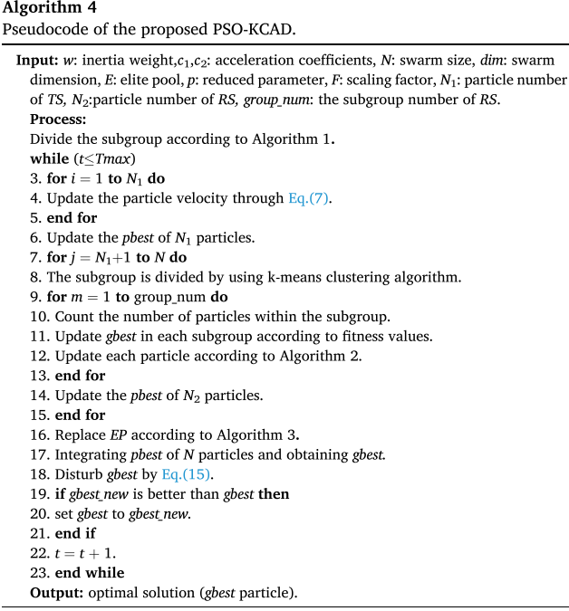 针对传统粒子群算法(PSO)易陷入局部最优、后期搜索效率低以及参数依赖性强等问题,本文提出了一种融合 k-means 聚类 与 自适应双群策略 的粒子群算法(PSO-KCAD),该方法通过双粒子群协同进化,在搜索初期强化全局探索能力,在后期提升局部开发效率。引入综合学习机制和精英--普通粒子分层策略,加强粒子间的信息交互,加速算法收敛。为了维持种群多样性并提高解的精度,算法进一步采用自适应精英替换机制与竞争干扰机制。