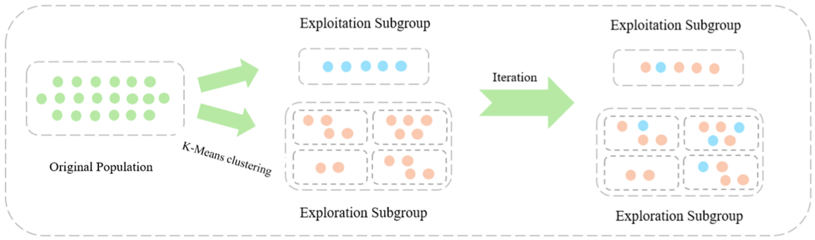 双群协同搜索策略将种群按索引划分为开发群(TS)与探索群(RS),其中 TS 由前 5 个粒子组成,其余粒子进入 RS。随后,RS 通过 k-means 聚类进一步分成 5 个子群,子群规模固定但成员随进化动态替换,以强化协同学习与信息共享。