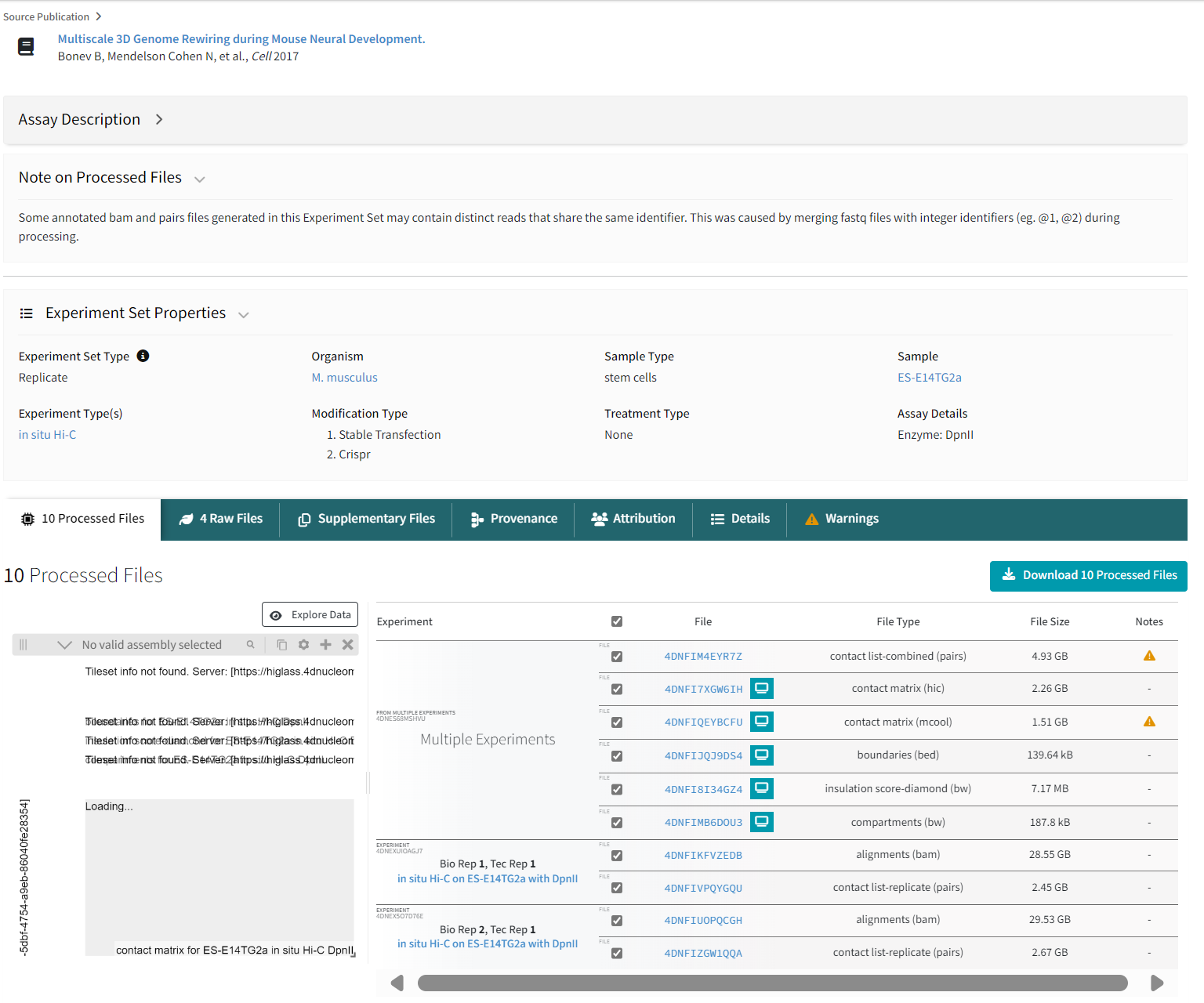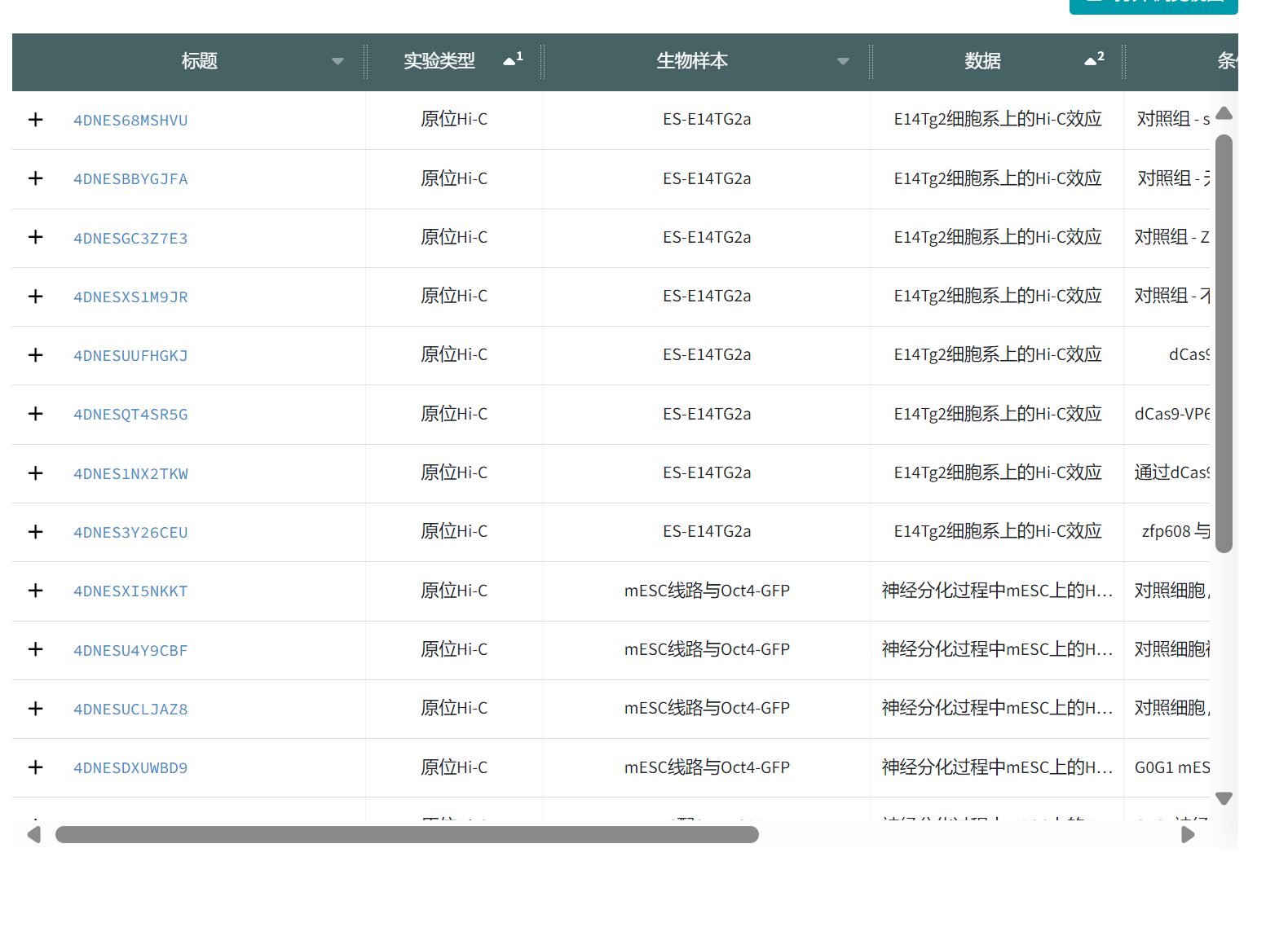 | 4DNES68MSHVU | 原位 Hi-C | ES-E14TG2a | E14TG2a 细胞系上的 Hi-C 反应 | ✔ 可能是骨架数据(需继续点开确认) |