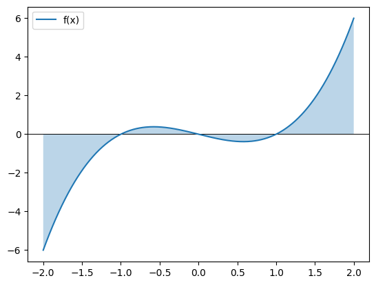 - 画出 f(x)=x³ − x 在区间 [-2, 2] 上的图像,并用填充颜色的方式展示"曲线下的面积"。
