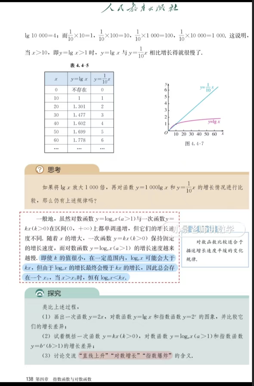 师: 其实,我们可以这样理解:虽然 ( \lg x ) 放大后在一定范围内可能比一次函数大,但随着 ( x ) 继续增大,一次函数的增长速度是固定的,而对数函数的增长速度是逐渐减小的,最终一定会被一次函数反超。也就是说,总存在某个 ( x_0 ),当 ( x > x_0 ) 时,恒有 ( \log_a x < kx )。