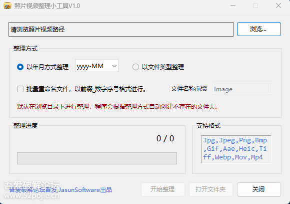吾爱大神原创工具\] 照片视频整理工具 V1.0 链接:[https://pan.xunlei.com/s/VOfnAFEztnvSGbvf7cW73fSlA1?pwd=ki5c#](https://pan.xunlei.com/s/VOfnAFEztnvSGbvf7cW73fSlA1?pwd=ki5c# "https://pan.xunlei.com/s/VOfnAFEztnvSGbvf7cW73fSlA1?pwd=ki5c#")  手机内存被照片视频填满了,导出来1W+的照片和视频,当手动要将这些照片和视频以"yyyy-MM"方式进行分类时,非常恼火。所以开发个小工具,以提高效率。 说干就干,用了一下午的时间开发了这个小整理工具,使用起来效率大大提升,所以现在发出来,以供有相同需求的小伙伴使用! 功能: 1、可以将同一目录下的所有视频,照片文件以"年月"或者"类型"进行分类,一键整理。 2、可以批量重命名这些整理的文件名称,文件名称默认以"前缀字符串"+数字序号进行。前缀字符串可自定义。
