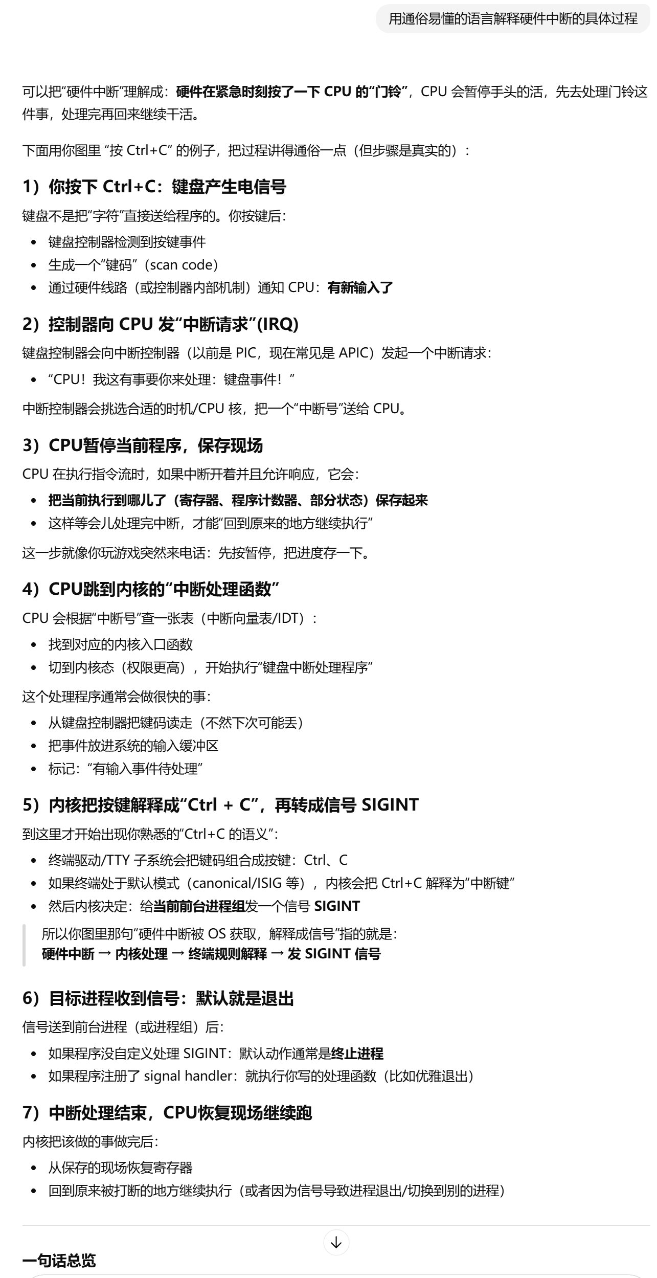 - 前台进程在运行过程中用户随时可能按下 Ctrl-C 而产生信号,也就是说该进程的用户空间代码执行