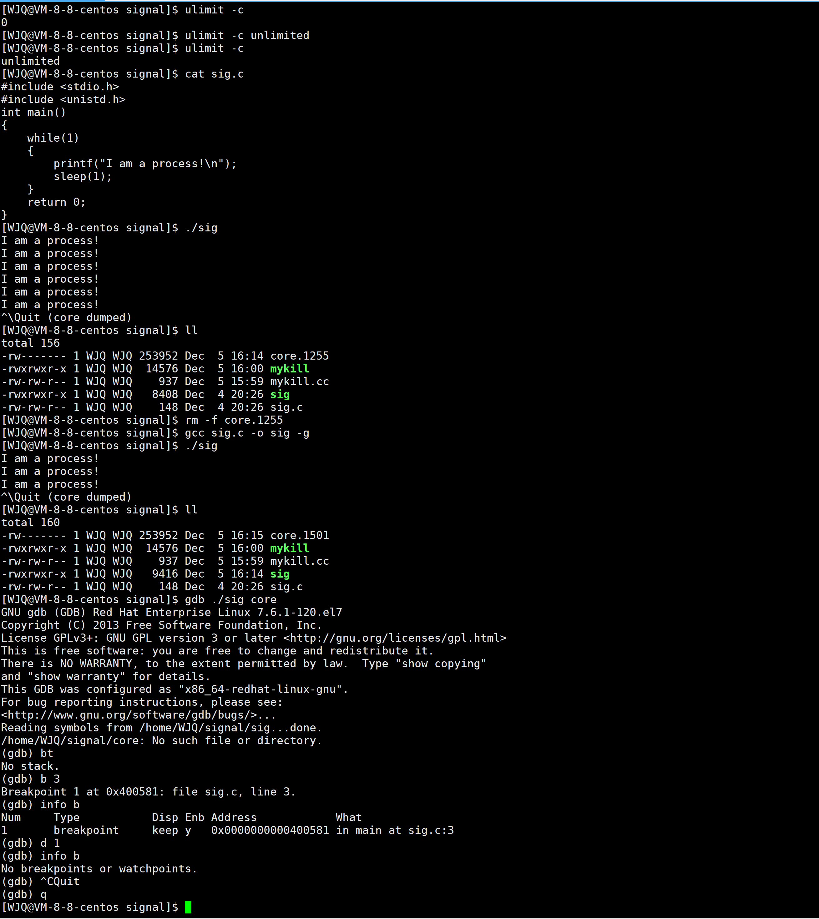 产生多大的core文件取决于进程的Resource Limit(这个信息保存 在PCB中)。默认是不允许产生core文件的,因为core文件中可能包含用户密码等敏感信息,不安全。在开发调试阶段可以用ulimit命令改变这个限制,允许产生core文件。