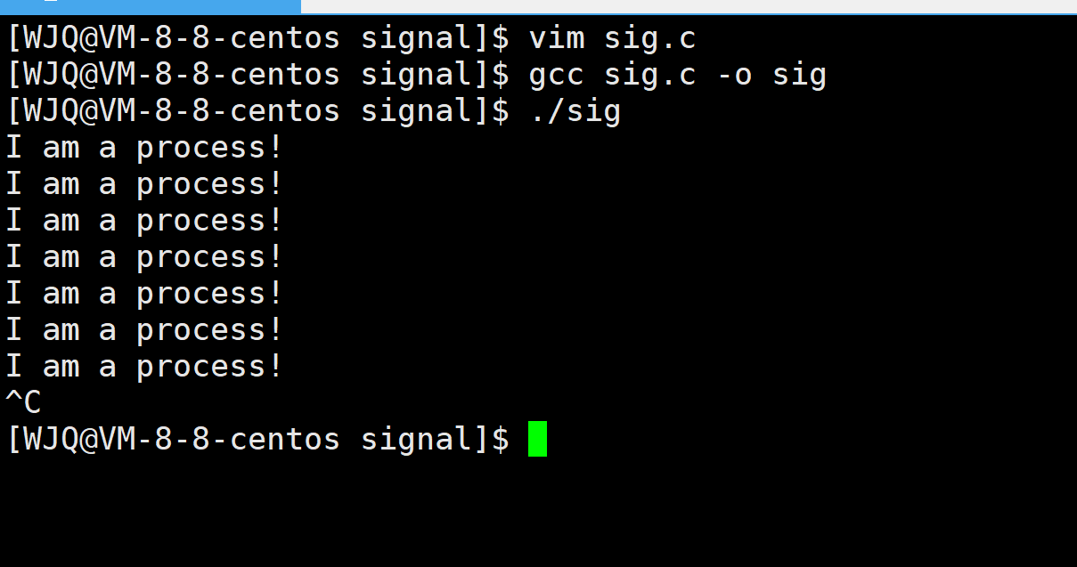 在shell下启动一个前台进程:用户按ctrl+c,这个键盘输入产生一个硬件中断,被OS获取并解释成信号,发送给目标前台进程,前台进程收到信号进而引起进程退出。