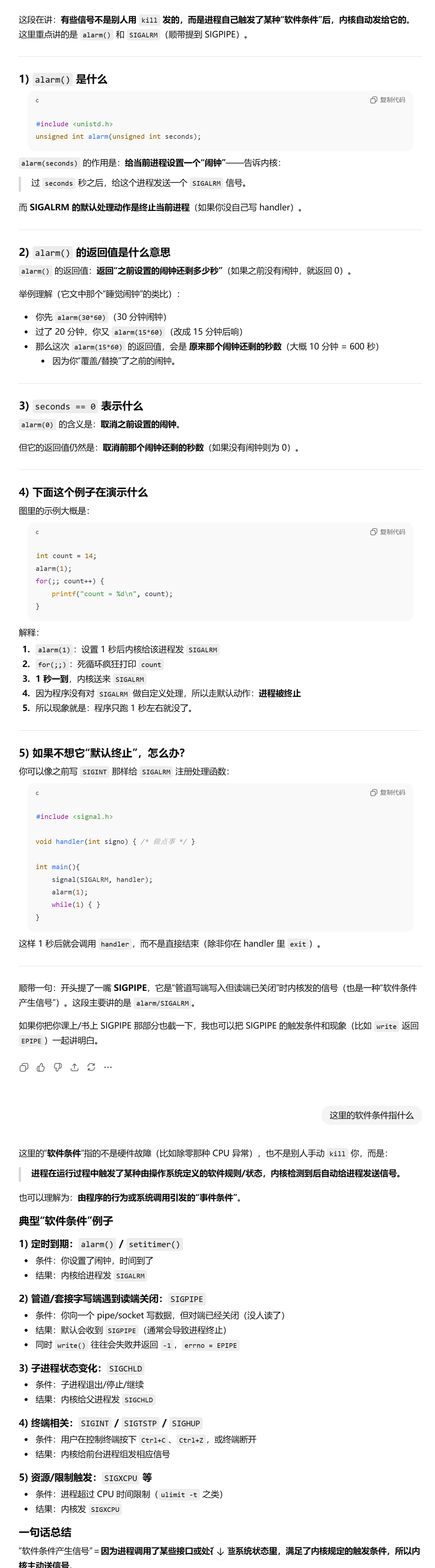 调用此函数可以设定一个闹钟,告诉内核在seconds秒后给当前进程发SIGALRM信号,该信号的默认处理动作是终止当前进程。