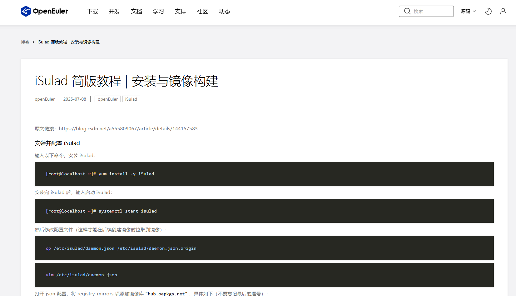 iSulad 简版教程 | 安装与镜像构建:https://www.openeuler.openatom.cn/zh/blog/20250708-iSulad-brief-tutorial/20250708-iSulad-brief-tutorial.html