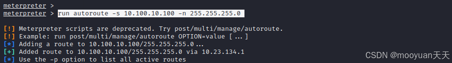run autoroute -s 10.100.10.0/24 #添加到达10.100.10.0网段的路由(CIDR格式添加)