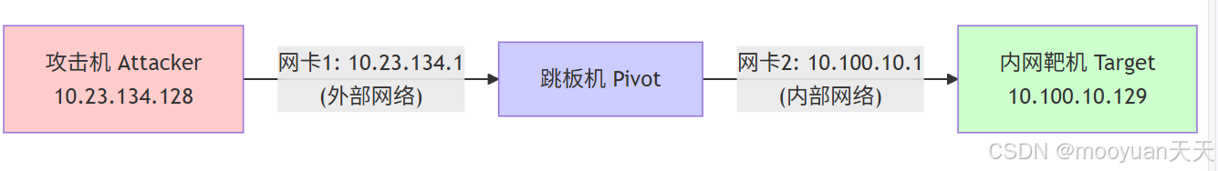 | 跳板机 (Pivot) | 10.23.134.1 10.100.10.1 | Windows 11,已被控制的双网卡主机。 连接外部网络(10.23.134.0/24)和内部目标网络(10.100.10.0/24)的桥梁 |