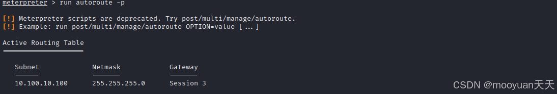 通过autoroute模块执行结果来看,这是一次成功的内网路由添加操作, 将网段 10.100.10.100/24(子网掩码 255.255.255.0)与 Session 3 绑定**。**接下来通过run autoroute -p查看路由表,运行结果如下所示。说明路由表中已新增该条目,表明 MSF 后续访问此网段的流量会通过 Session 3 对应的跳板机进行转发。