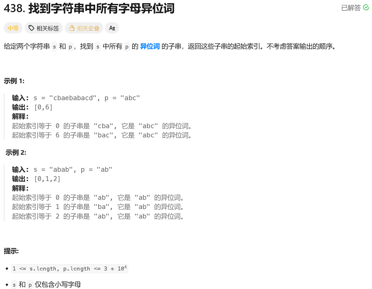 - 判断截取的字符串是否为p的异位词,直接比较两个数组是否相同(相同说明每个字母对应的总数相同 即为异位词)