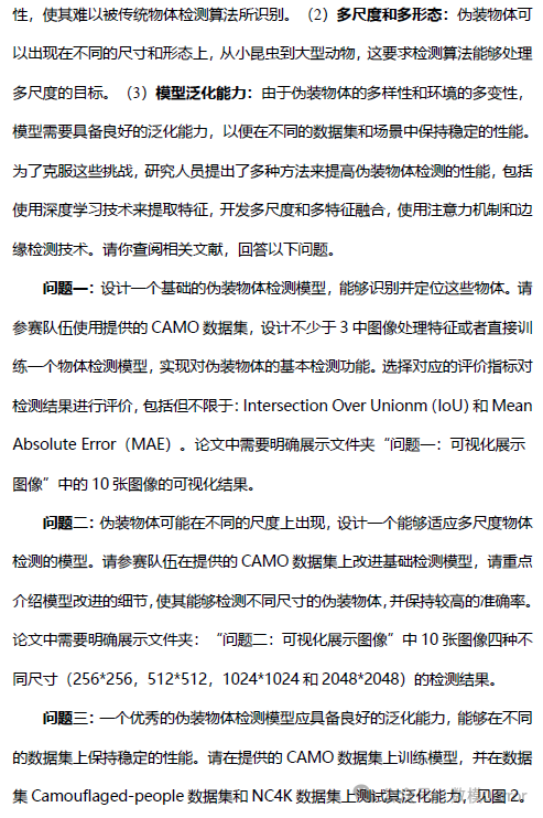 - 目标:在 CAMO 数据集上改进基础检测模型,使其能检测不同尺寸目标,并展示"问题二:可视化展示图像"中 10 张图在 256×256、512×512、1024×1024、2048×2048 四个尺寸下的检测结果。