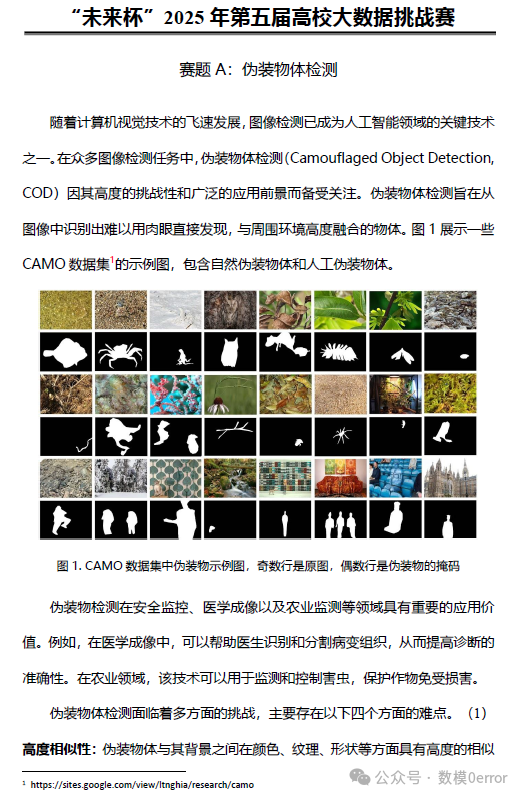 伪装物体检测(Camouflaged Object Detection, COD)是视觉任务中挑战性很高的一类:目标在颜色、纹理、边缘与背景高度相似,导致典型的物体检测或语义分割器性能下降。基础方法可分为两类路径:基于显式图像处理特征+传统分类器(例如边缘、颜色对比、纹理滤波器、局部对比度、超像素显著性测算等),或直接基于深度学习(U-Net / DeepLab / Mask R-CNN / SegFormer 等)端到端训练。对于竞赛与研究来说,一般以深度学习分割模型作为基线,并在其上结合显式特征或注意力模块增强性能。